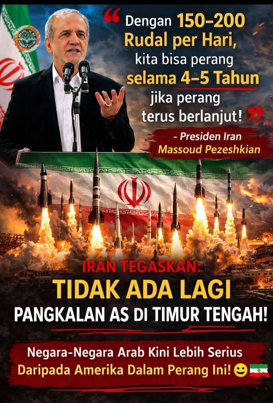 Dalam pernyataan yang disampaikan baru-baru ini, Pezeshkian menegaskan bahwa Iran memiliki persenjataan yang cukup untuk meluncurkan sekitar 150 hingga 200 rudal setiap hari, bahkan mampu mempertahankan intensitas tersebut selama empat hingga lima tahun apabila perang benar-benar terjadi.